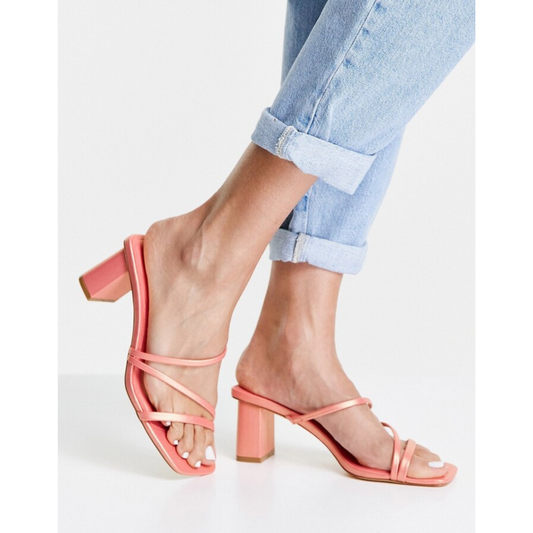 Multi Strap Peach Shiny Block Heels Sandals