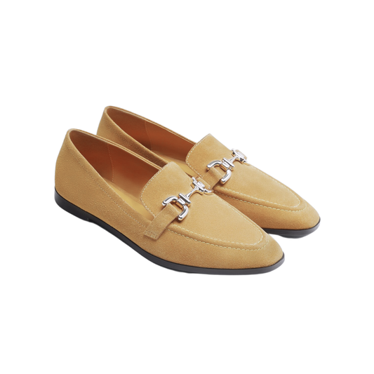 Beige Suede Slip-On Moccasins with Gold Buckle